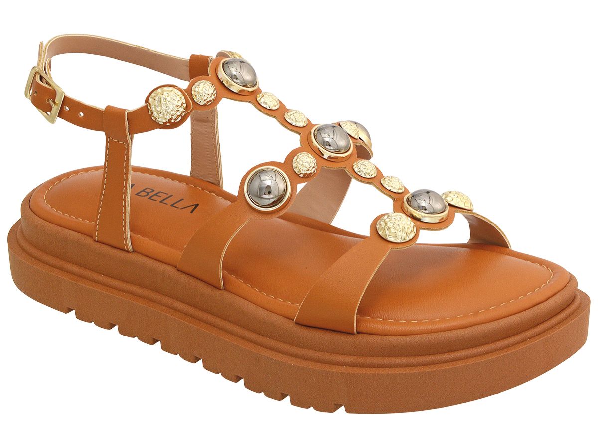 O design é sofisticado, com tiras em couro sintético de alta qualidade e aplicações metálicas douradas e prateadas que dão um toque fashion e exclusivo ao calçado. O fechamento em fivela ajustável proporciona praticidade e segurança para o dia a dia.